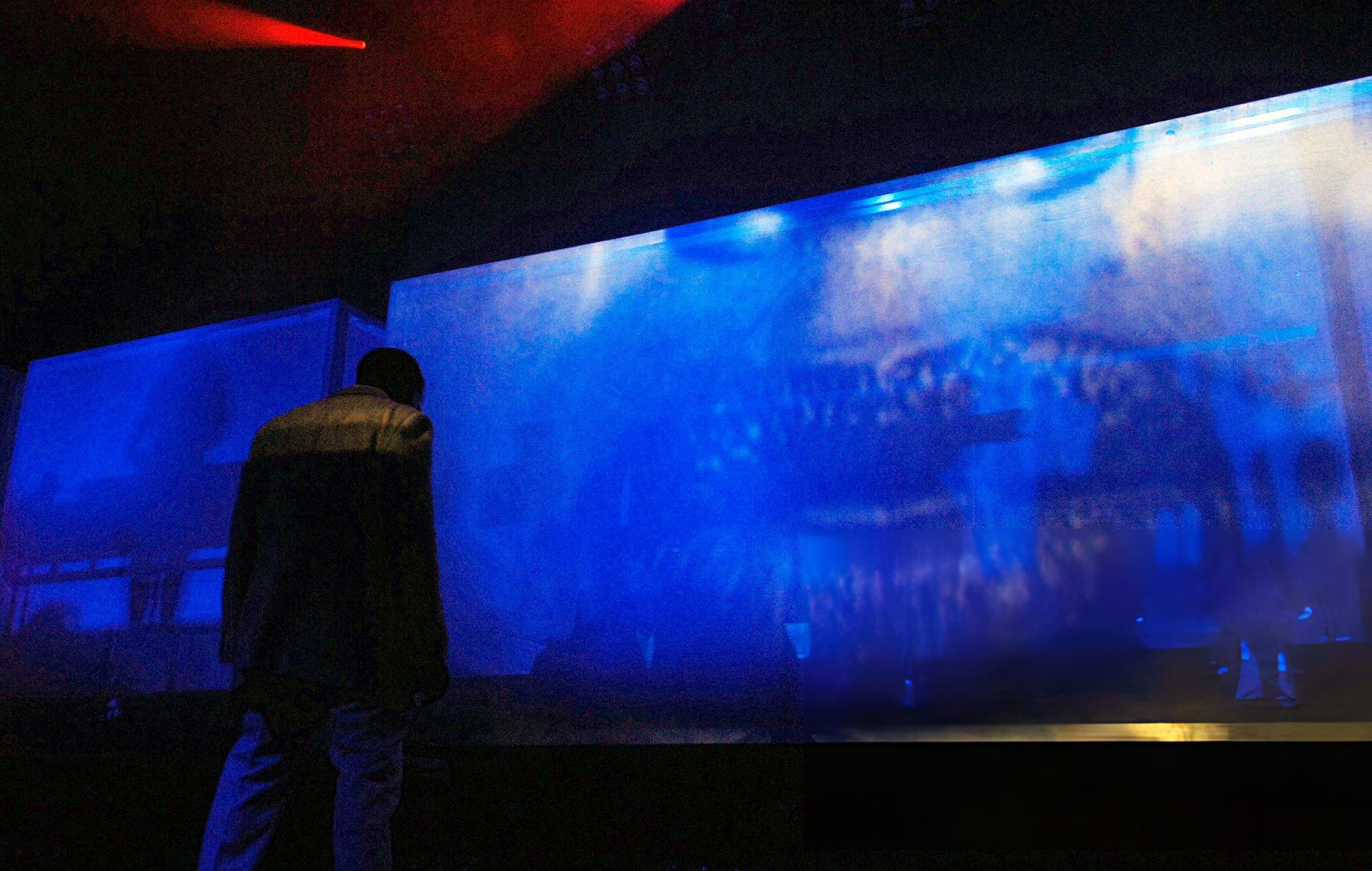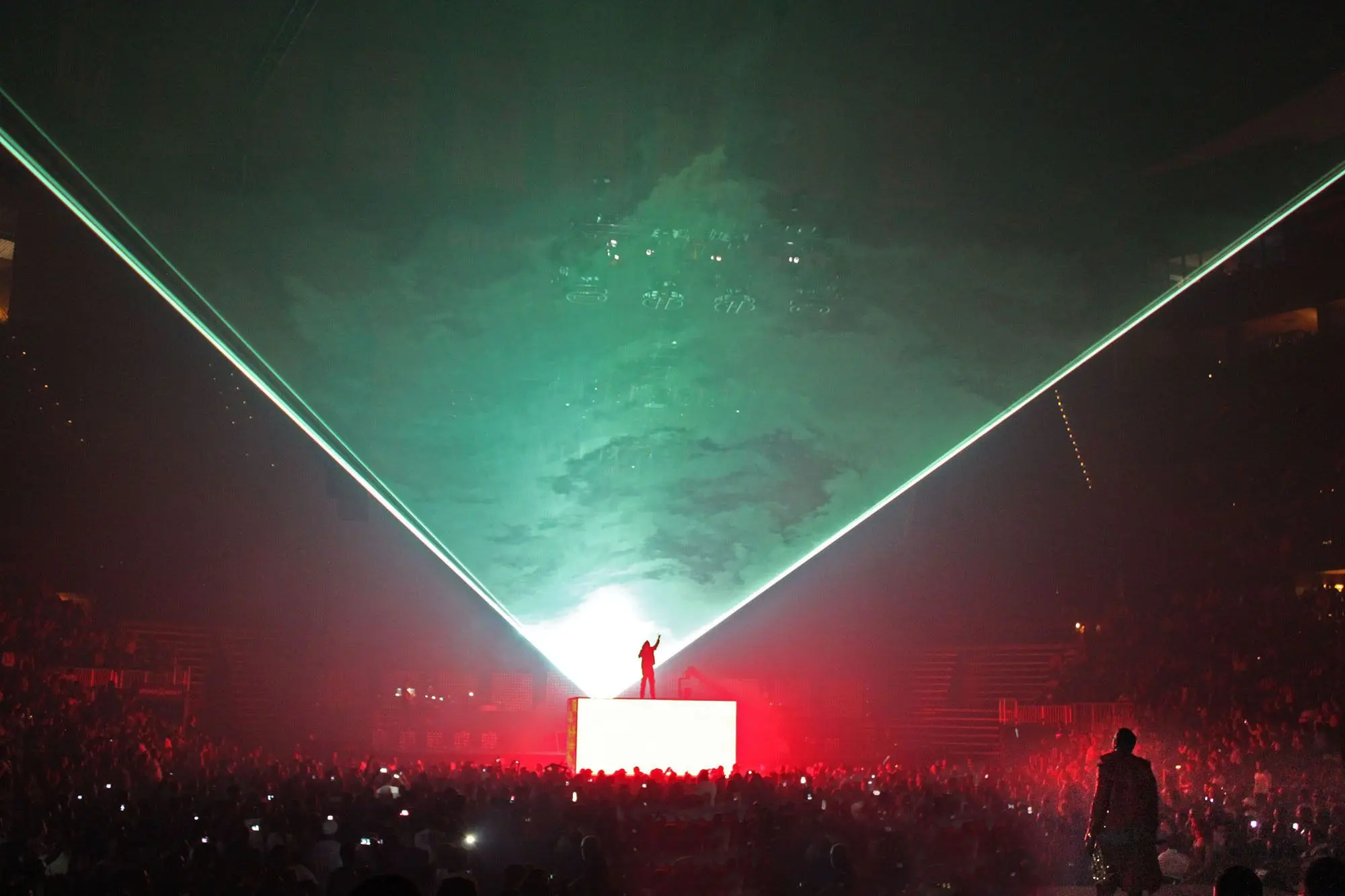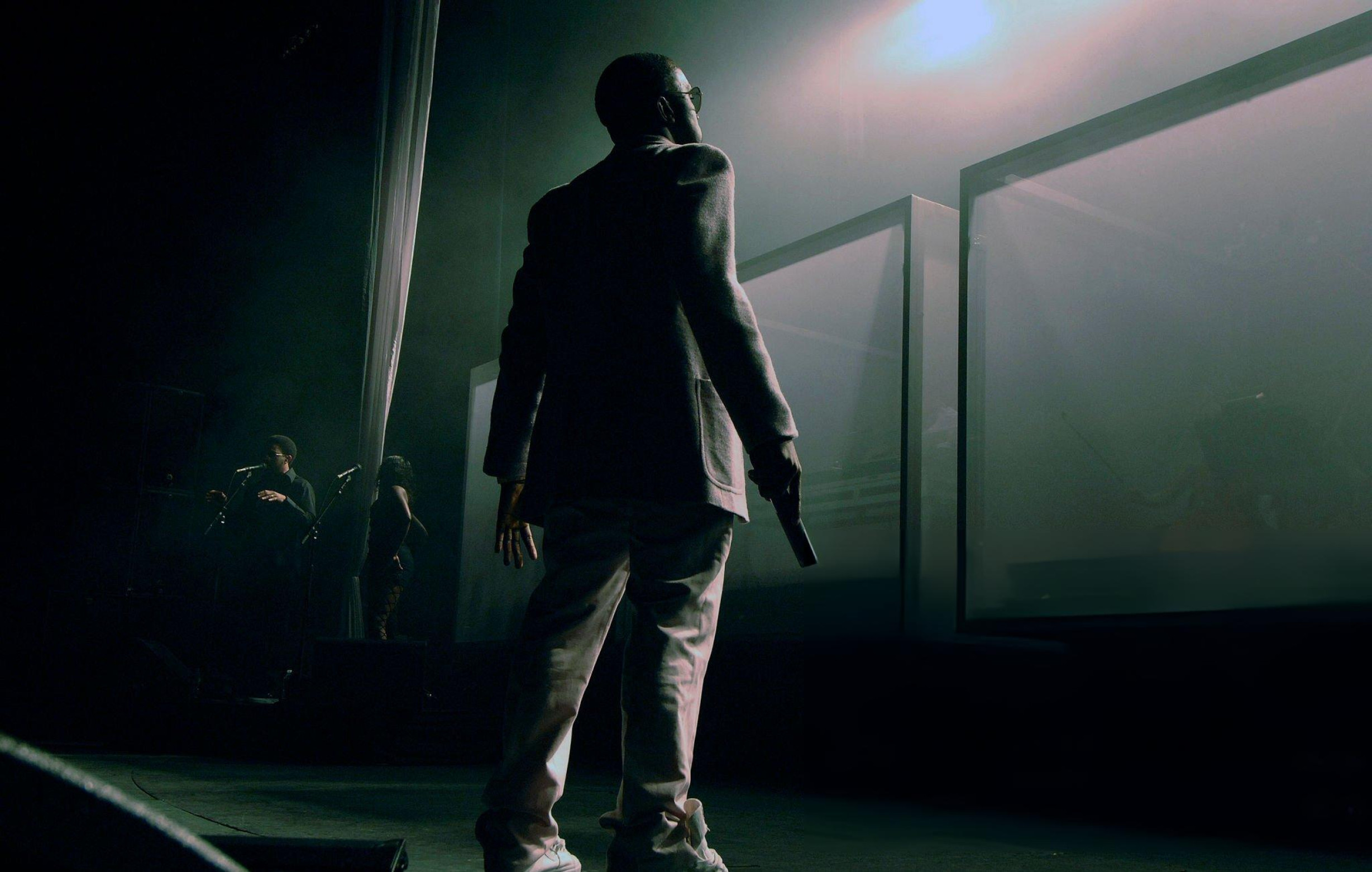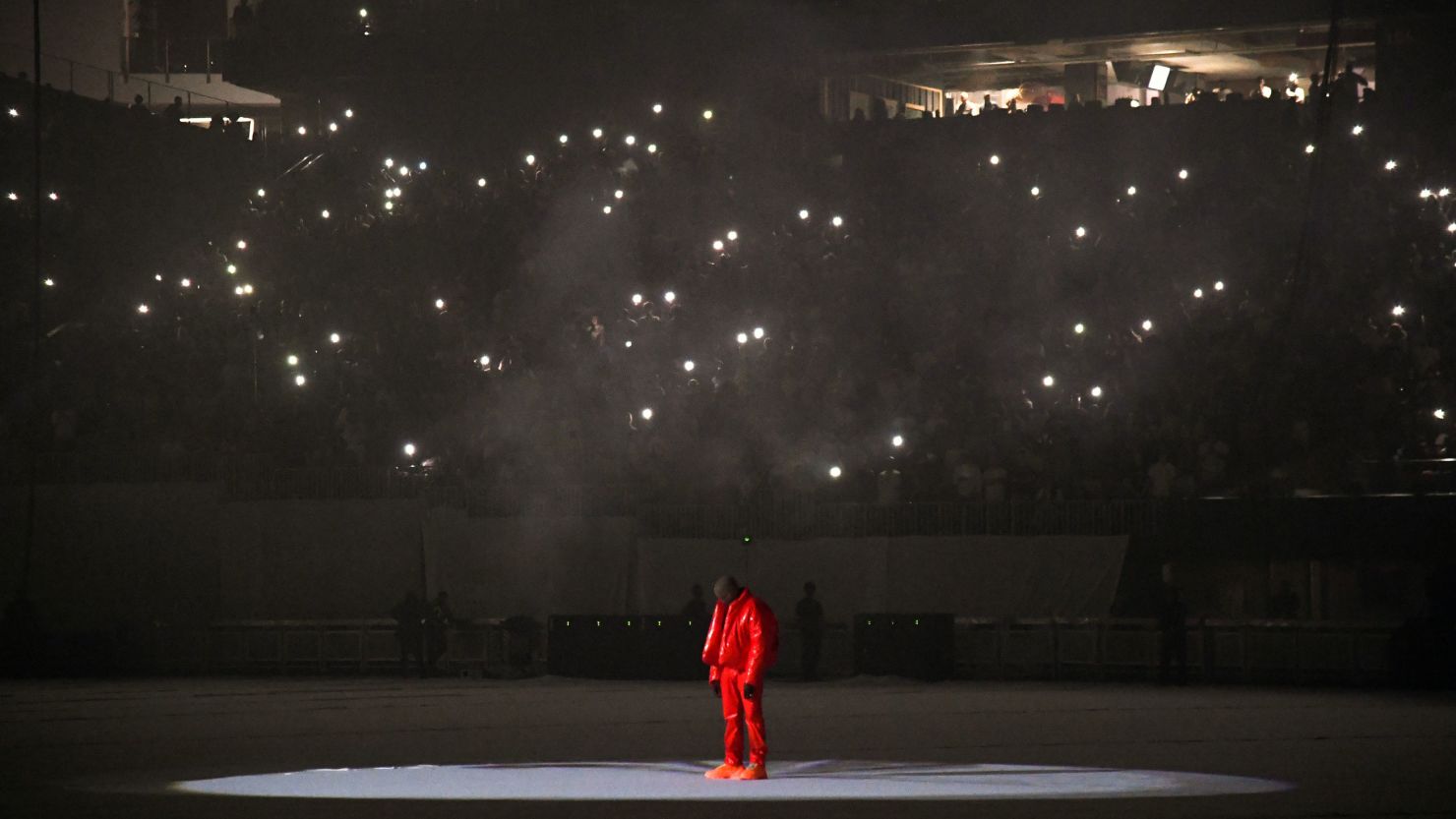 YE and Kid Cudi performed inside a floating transparent glass/acrylic box suspended above the stage, a minimalist “prison” concept with saturated projections and smoke.