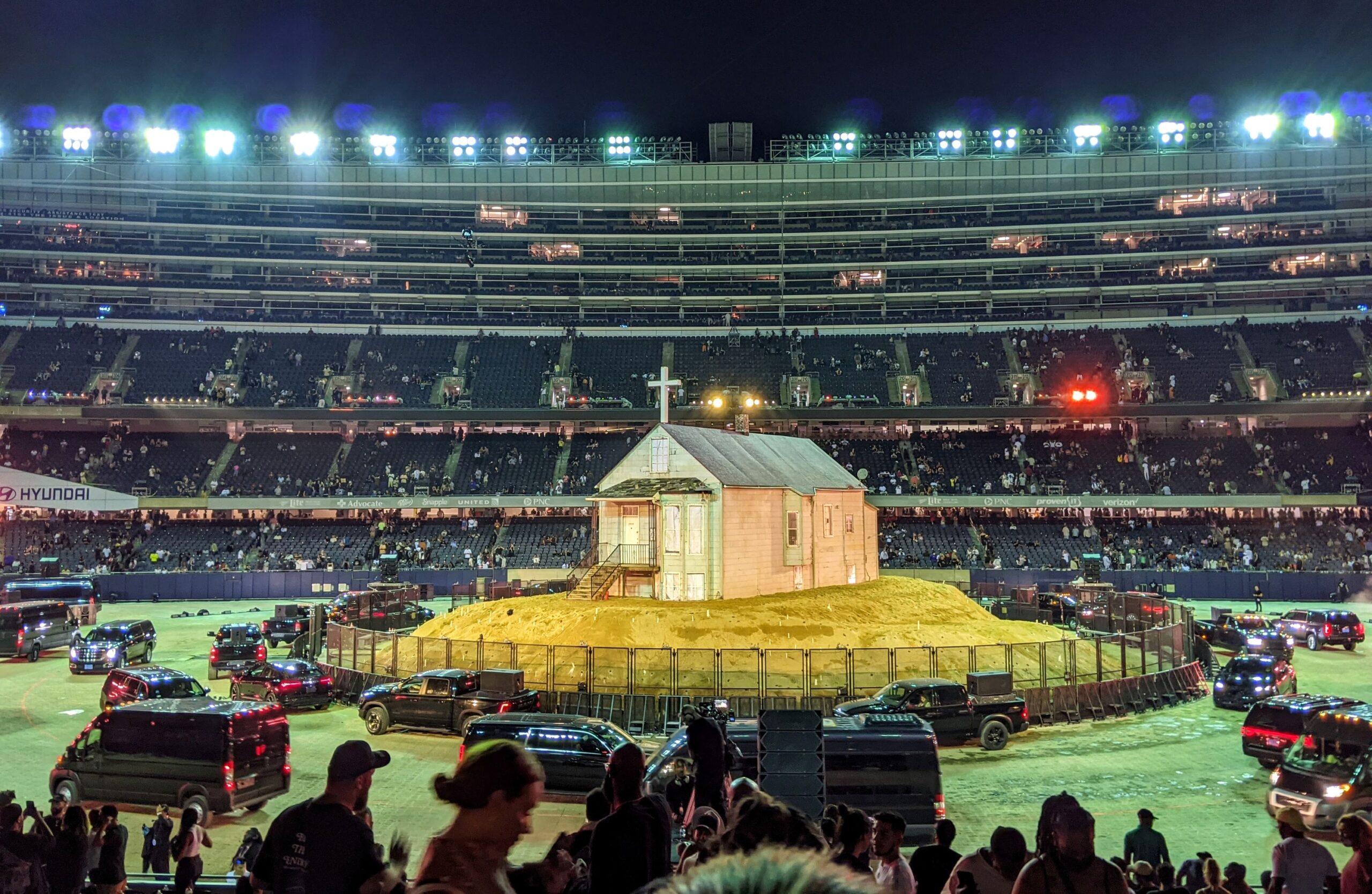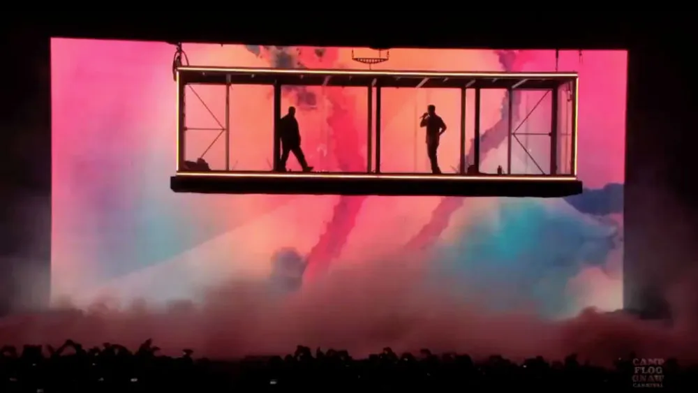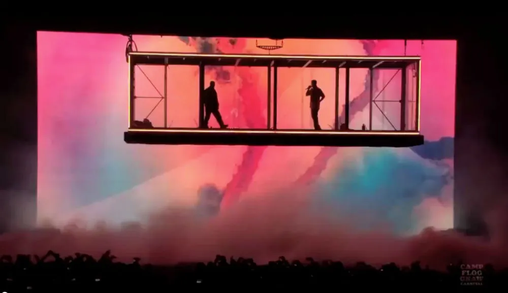Collaborating closely with creative director Eli Russell Linnetz and a team of engineers after months of intensive planning and multiple designer auditions, YE introduced a groundbreaking floating rectangular platform suspended by a complex truss and high-speed motor system. This revolutionary stage could move dynamically in all directions above the crowd, tilting, hovering just feet above fans, and creating an unprecedented sense of intimacy and god-like elevation.